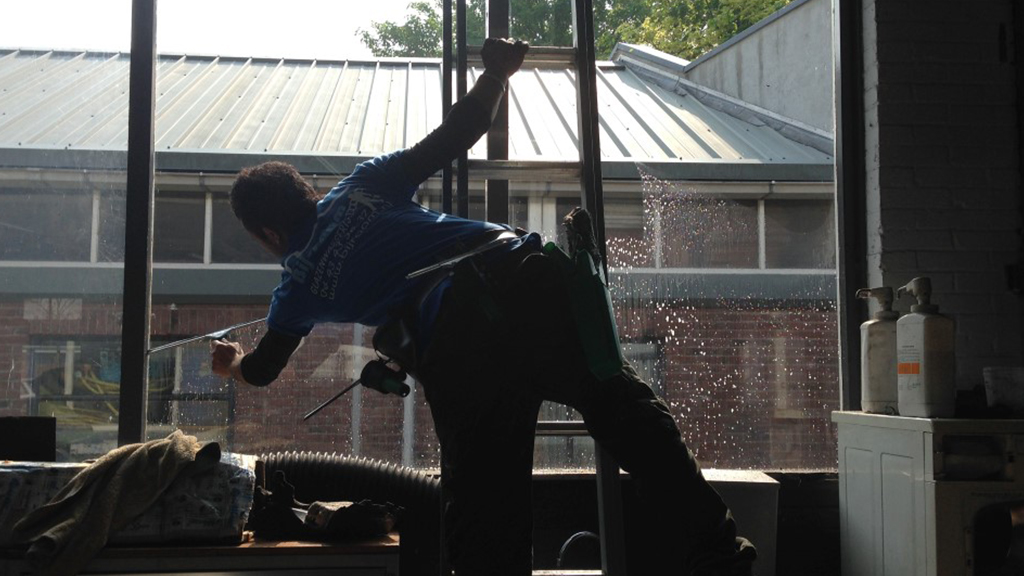 Het raam wordt schoongemaakt met de inwasser. Daarna wordt het raam drooggemaakt met behulp van een trekker.